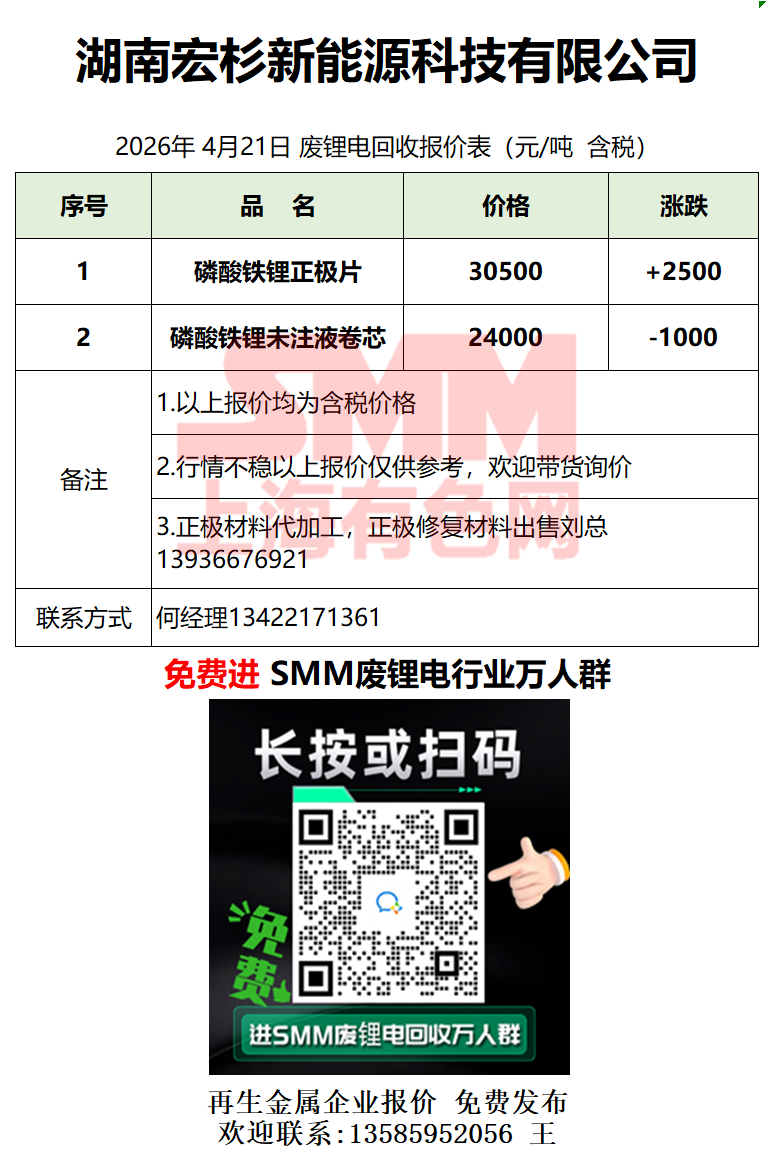 4月21日湖南宏杉 废锂电采购报价