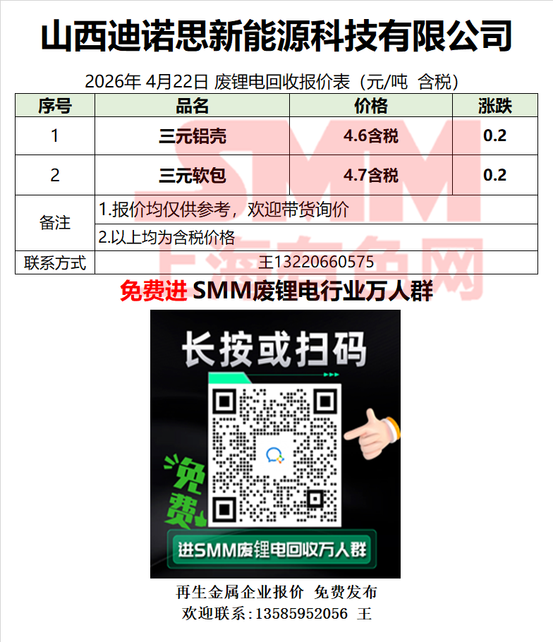 4月22日山西迪诺思 废锂电采购报价