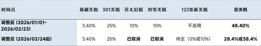 在此次政策调整前,中国出口至美国的储能电池产品面临着极为复杂的税种叠加压力。根据此前法律框架及2025年间的多次调整,中国储能电池的综合关税率在2026年初已达到高位。截至2026年2月23日,原有的关税构成与最新调整对比如下: