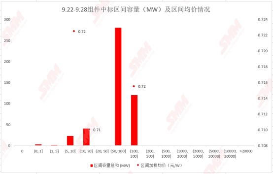 经SMM分析,当周光伏组件中标价格主要集中于0.69~0.74元/瓦区间,单周加权均价为0.72元/瓦,较上周上涨0.01元/瓦。均价上涨原因为受到主要中标容量区间加权均价的影响:在披露价格的区间中,容量占比最大的为100MW-200MW,该区间容量占比25.71%,区间均价为0.72元/瓦,该区间上周均价为0.71元/瓦;