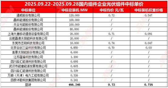 通威股份有限公司,晶科能源股份有限公司,天合光能股份有限公司,上海大唐移动通信设备有限公司,合肥晶澳太阳能科技有限公司,东莞市志翔科技有限公司,北京合创三益科技有限公司,高景太阳能股份有限公司,江苏蕴福科技有限公司,四川淼汇能源科技有限公司,武汉市能建能源发展有限公司,四川淼汇能源科技有限公司,万顺(天津)电力工程有限公司,四季沐歌科技集团有限公司等共计42项,数据处理后,披露装机容量项目共15项,披露中标装机价格4项,当周采购定标组件型号主要为N型组件。