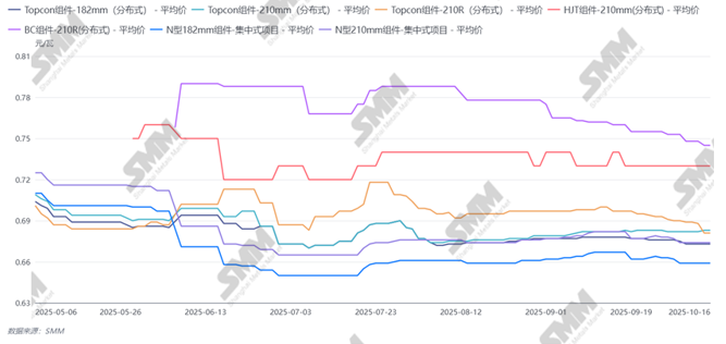 10月当前分布式报价价格分别为:BC组件-210R(分布式)报价(0.735-0.755元/瓦);HJT组件-210mm(分布式)报价(0.717-0.733元/瓦);Topcon组件-182mm(分布式)报价(0.662-0.683元/瓦);Topcon组件-210mm(分布式)报价(0.673-0.692元/瓦);Topcon组件-210Rmm(分布式)报价(0.671-0.691元/瓦)。 截至当前,10月组件不同版型价格已出现明显分化,210R价格下跌速度较快,反观210组件由于供应竞争的影响,企业报价已开始上升,部分企业成交已上升至0.70元/瓦以上。
