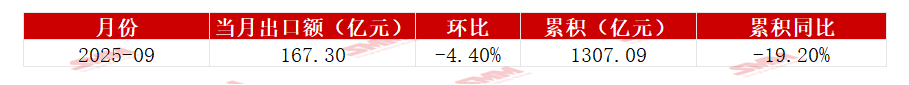 SMM10月20日讯:据SMM统计,9月国内光伏组件出口额为167.3亿元,环比减少4.4%,2025年累积进出口额1307.09亿元,同比减少19.20%。