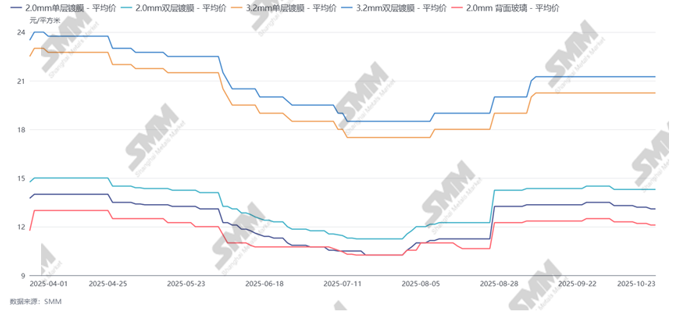 10月当前玻璃报价价格分别为:2.0mm单层镀膜报价(12.6-13.6元/平方米);2.0mm双层镀膜报价(13.6-14.6元/平方米);3.2mm单层镀膜报价(19.5-21.0元/平方米);3.2mm双层镀膜报价(20.5-22.0元/平方米);2.0mm背面玻璃报价(11.6-12.6元/平方米)。本周国内竞价氛围浓厚,虽然头部玻璃企业挺价情绪较为一致,但当前国内部分二线企业以及三线企业库存水位压力持续增加,迫于后续订单,故开始让利出货,据SMM了解,当前市场2.0mm单层镀膜玻璃最低成交基准价格已下降至12.5元/平方米左右,预计后续仍有继续下调可能。