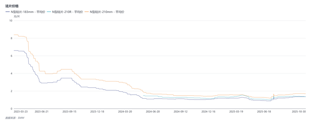 【SMM评述:月末硅片价格出现松动】本周(10.27-10.31)整体硅片价格震荡下跌,N型183硅片价格在1.33-1.35元/片,210R硅片报价为1.33-1.38元/片,210mm硅片报价为1.68-1.7元/片。
