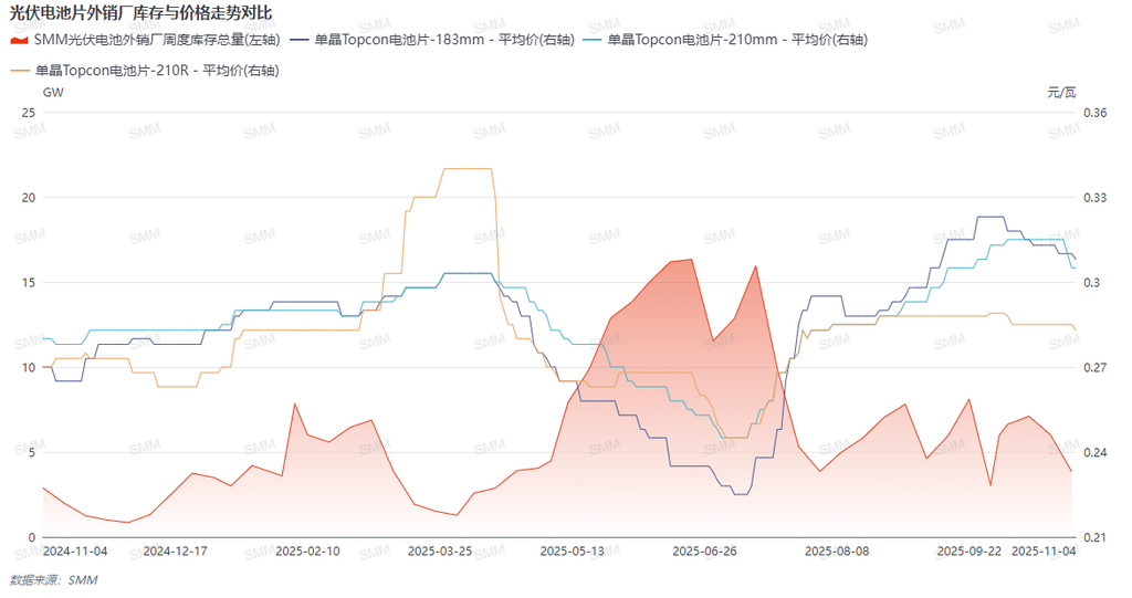 【SMM光伏电池片上游周度库存(2025.10.28-11.03)】得益于电池厂商在月末实施的降库措施,电池片环节的库存水平较上周出现明显下降。进入月初,各厂商有序生产交付。分尺寸看,183N与210RN延续之前的走弱行情,累库风险较大。210N供需面出现变化:随着集中式高效电池片订单陆续进入交付尾声,以及组件厂的成本控制要求,市场采购需求有所回落,210N开始累库。目前市场上游库存在4GW左右,周环比-36.1%,年同比33.2%。