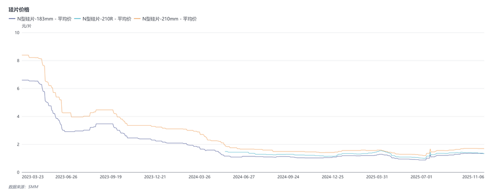 【SMM评述:硅片价格松动根源在过度代工】本周(11.3-11.7)整体硅片价格小幅下跌,N型183硅片价格在1.30-1.33元/片,210R硅片报价为1.33-1.35元/片,210mm硅片报价为1.68-1.7元/片。
