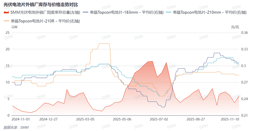 【SMM光伏电池片上游周度库存(2025.11.03-11.10)】下游市场需求持续转淡,各尺寸电池片出货普遍承压。其中,183N与210N尺寸受下游外采需求萎缩影响,库存水平有所上升。而210RN尺寸因海外市场加速转向大尺寸产品,需求表现相对平稳。然而,由于该规格生产企业众多、供给持续释放,市场供需始终难以达到平衡状态,电池厂库存持续累积。据最新统计,目前光伏电池片市场上游库存约6GW,周环比-12.4%,年同比193.4%。
