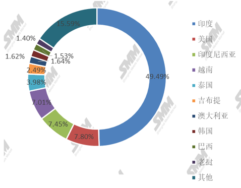相比9月份数据,中国出口至印度贸易量为18.37万吨,环比微增0.67%,占总出口量的49.49%,出口占比增长较多,但实际出口量变化不大,主要由于其他地区占比下降较多的影响,近期印度本土生产玻璃由于出口溢价的原因下主要以出口为主,而当地组件需求主要依赖于中国出口,故整体需求量变化有限;中国出口至美国贸易量为2.89万吨,环比减少31.84%,占总出口量7.80%,9月开始,美国当地对于光伏发展遏制力度再度增强,农用光伏受打压较大,组件需求快速下降,部分组件生产企业面临破产危机,故对中国玻璃需求量持续减少,预计11月出口量仍将继续降低;中国出口至印度尼西亚贸易量为2.76万吨,环比大减50.18%,占比下降至7.01%,前期印尼连续多月对中国光伏玻璃需求量增长,随着海外整体装机旺季的结束,印尼开始消耗自身前期囤货库存,阶段性采买需求下降,但印尼未来对光伏预期仍较为乐观,后续增长趋势表现仍然明显;中国出口至越南贸易量为2.60万吨,环比增加24.40%,占总出口量的7.01%;中国出口至泰国贸易量1.48吨,环比减少57.95%,占总出口量的3.98%。