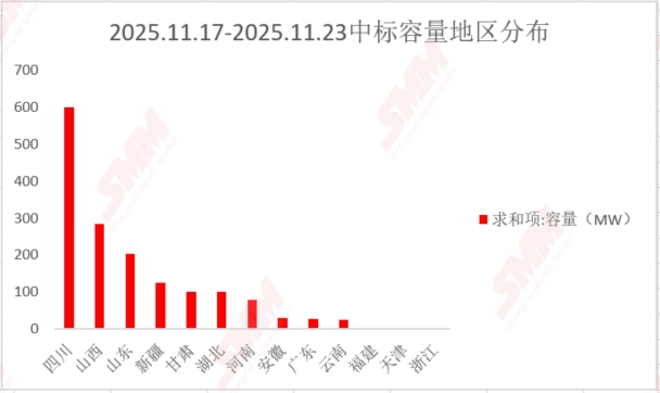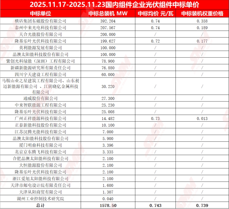 2025年11月17日至2025年11月23日, 当前统计区间SMM统计国内中标:横店集团东磁股份有限公司,泰州中来光电科技有限公司,天合光能股份有限公司,隆基乐叶光伏科技有限公司,英利能源发展有限公司,晶澳太阳能科技股份有限公司,紫创光科绿能(深圳)工程有限公司,新疆新能源研究所有限责任公司,四川宇天建设工程有限公司,马鞍山业之星建筑工程有限公司、山东昶迈新能源有限公司 、江阴晓亿金属科技有限公司,通威股份有限公司,等共计44项,数据处理后,披露装机容量项目共26项,披露中标装机价格项目共4项,当前统计区间采购定标组件型号主要为N型组件。