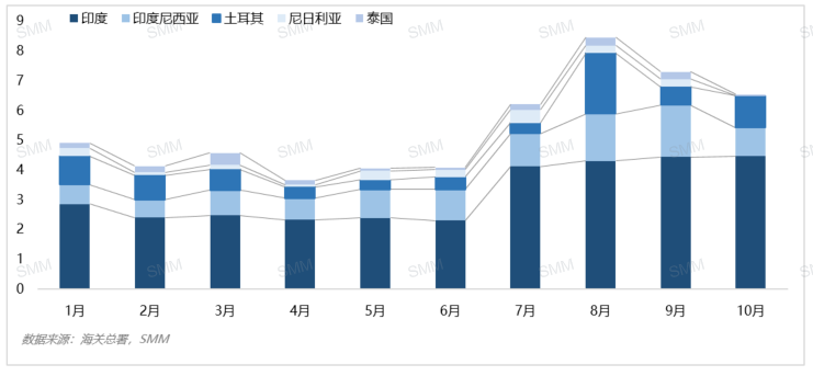 与此同时,海外采购节奏也在放缓。海关总署数据显示,9月和10月的出口量分别环比下降13.16%和0.2%。从重点市场看,1-10月前五大出口目的地(印度、印尼、土耳其、尼日利亚、泰国)近两月采买增速普遍放缓。其中,土耳其因短期进口政策导致数据波动较大;但即便剔除这一扰动,总采买量增速也连续放缓,9月与10月环比已分别降至4.3%和3.3%。随着海外下游库存水平持续攀升,市场对国内过剩产能的吸纳能力减弱。综上,国内外需求的同步收缩,使得电池片环节的供给过剩问题在短期内进一步凸显。