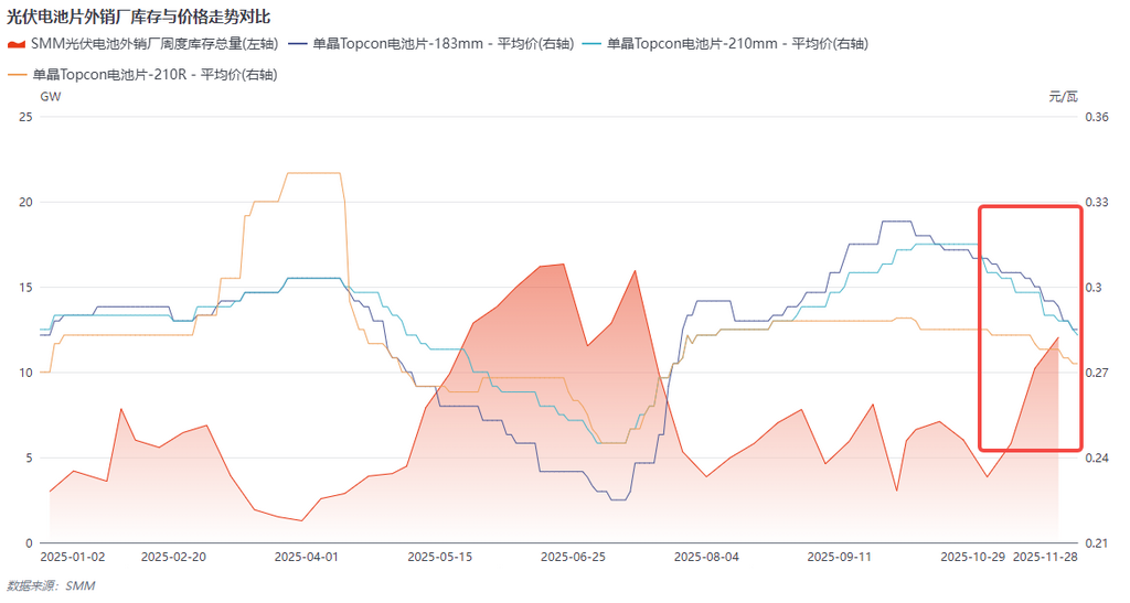 站在10月末那个时间点,多数企业仍对减产持观望态度。一是对Q4这一传统需求旺季抱有期待,若年底出现抢装,11月就可能有潜在需求做支撑;二是顾虑减产本身的成本——电池产线启停成本大,即使是热停也需2-3天时间才能完成爬产,并且减产后会削弱规模化生产带来的边际收益。于是,企业在观望中维持开工,导致库存在11月快速攀升。累库预期下,买方市场格局强化。电池厂开始为买方的压价让步,以换取更多的订单,价格也在激烈竞价过程中步步跌落。以210N尺寸为例,从Q3反内卷时达到的高点0.32元/W下跌到如今的0.285元/W。价格逐渐贴近现金成本,企业利润被严重挤压,对上游硅片、硅料的价格“倒逼”也愈发明显。