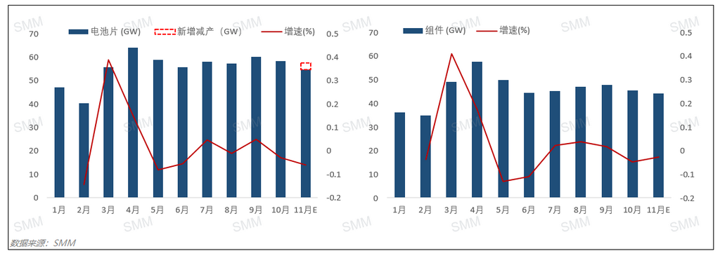 进入11月,光伏电池片延续10月跌势,步步下行,主要压力来自于供需失衡的进一步扩大。一方面,下游组件厂商减产力度加大,产量持续收窄。一位一线电池厂销售人员向SMM反映,11月市场直采订单呈现出“断崖式下跌”;另一位一体化厂电池片采购人员也提到,11月国内市场直采量几乎只有10月的一半。