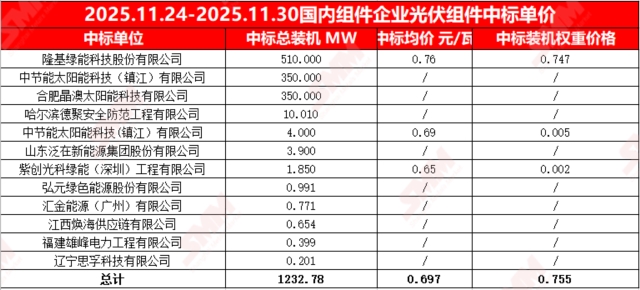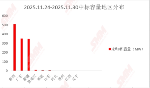 2025年11月24日至2025年11月30日, 当前统计区间SMM统计国内中标:隆基绿能科技股份有限公司,中节能太阳能科技(镇江)有限公司,合肥晶澳太阳能科技有限公司,哈尔滨德聚安全防范工程有限公司,山东泛在新能源集团股份有限公司,紫创光科绿能(深圳)工程有限公司,弘元绿色能源股份有限公司,汇金能源(广州)有限公司,江西焕海供应链有限公司,福建雄峰电力工程有限公司,辽宁思孚科技有限公司共 12项,数据处理后,披露装机容量项目共26项,披露中标装机价格项目共3项,当前统计区间采购定标组件型号主要为N型组件。