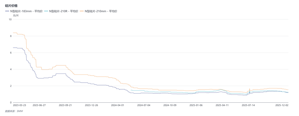 【SMM评述:210R硅片已经击穿现金成本】本周整体硅片价格下跌,N型183硅片价格在1.15-1.2元/片,210R硅片报价为1.18-1.25元/片,210mm硅片报价为1.48-1.55元/片。