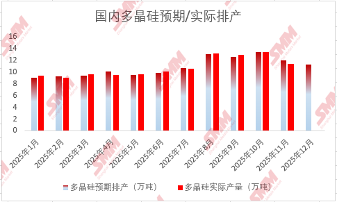 据SMM数据显示,临近年末,多家多晶硅头部企业开启减产或迟滞爬产节奏,造成11-12月多晶硅产量远不及预期。调研显示11月国内多晶硅最终产量为11.46万吨,环比10月下降14.48%;12月预计多晶硅排产11.35万吨,多晶硅排产将继续下滑。而在此前,市场对11月多晶硅产量预期普遍在12万吨左右。