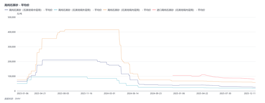 【SMM评述:进口高纯石英砂价格继续下跌】本周,国内高纯石英砂报价小幅下跌,内层、中层、外层高纯石英砂价格持稳,进口砂散单价格下跌1000元。