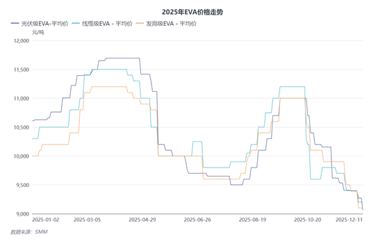 在新产能投放与需求持续疲软的双重压力下,EVA市场价格延续下跌态势。本周贸易市场光伏级EVA价格区间已下跌至8700-9000元/吨,较月初下跌约400元/吨。当前市场整体成交氛围较为清淡,下游胶膜企业订单有限,采购仍以刚需为主,供需矛盾下市场维持偏弱运行。