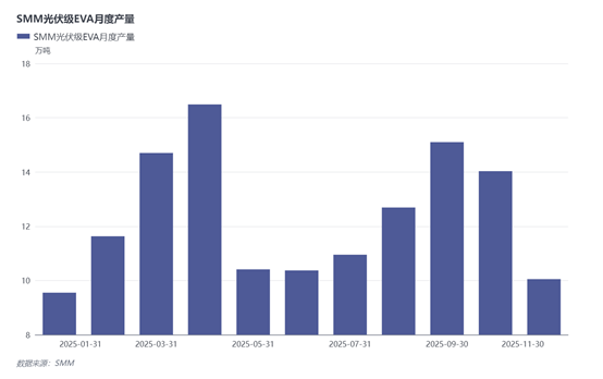 12月份,EVA市场面临供应增量显著与需求持续收缩的双重压力。供应端国内50万吨/年新增产能投产,供应过剩压力加剧,月内部分石化企业存检修及转产预期,光伏料供应压力虽有缓解,但整体供应仍呈现过剩态势,预计12月份EVA光伏料产量环比11月上升15%,而需求端12月份组件排产大幅下滑,预计环比下降18.97%,下游胶膜厂订单随之萎缩,故胶膜企业多维持刚需采购,供应过剩叠加需求跟进不足的双重作用下,石化厂库存预计再度上行,进而对价格形成持续压制。