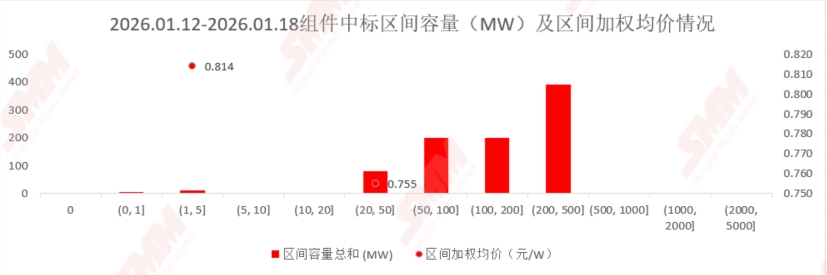2026年1月12日至2026年1月18日, 当前统计区间SMM统计国内中标:环晟光伏(江苏)有限公司,东方日升新能源股份有限公司,正泰新能科技股份有限公司,高景太阳能股份有限公司,杭钢智安(浙江)科技有限公司等共 20项,数据处理后,披露装机容量项目共12项,披露中标装机价格项目共3项,当前统计区间采购定标组件型号主要为N型组件。