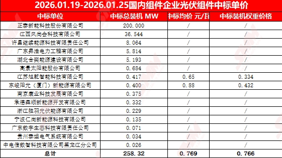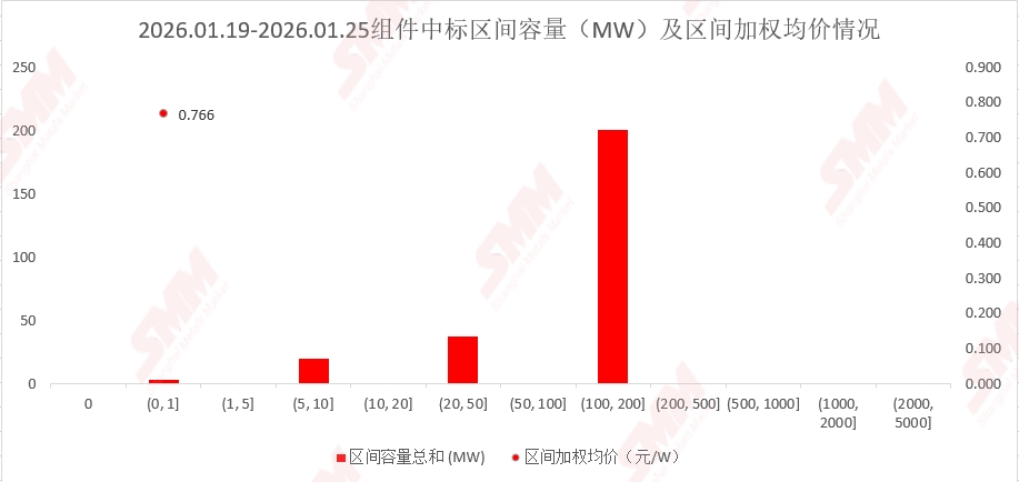 2026年1月19日至2026年1月25日, 当前统计区间SMM统计国内中标:正泰新能科技股份有限公司,江西风尚会科技有限公司,许昌继续能源科技有限责任公司,广东昇浩电力工程有限公司,湖北合奕能源建设有限公司,高景太阳能股份有限公司等共 20项,数据处理后,披露装机容量项目共15项,披露中标装机价格项目共2项,当前统计区间采购定标组件型号主要为N型组件。